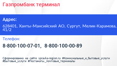 Газпромбанк, терминал по адресу 628401, Ханты-Мансийский АО, Сургут, Мелик-Карамова, 41/2 в дальнейшем Организация, размещена в следующих категориях: