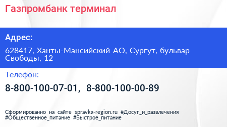 Газпромбанк, терминал по адресу 628417, Ханты-Мансийский АО, Сургут, бульвар Свободы, 12 в дальнейшем Организация, размещена в следующих категориях: