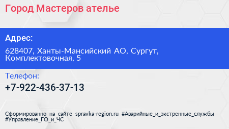 Город Мастеров, ателье по адресу 628407, Ханты-Мансийский АО, Сургут, Комплектовочная, 5 в дальнейшем Организация, размещена в следующих категориях: