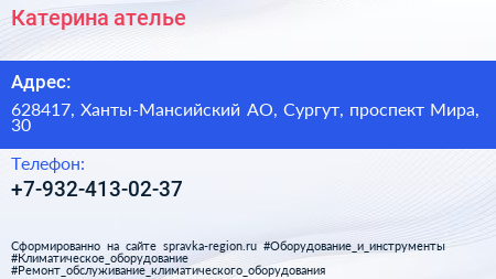 Катерина, ателье по адресу 628417, Ханты-Мансийский АО, Сургут, проспект Мира, 30 в дальнейшем Организация, размещена в следующих категориях: