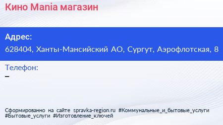 Кино Mania, магазин по адресу 628404, Ханты-Мансийский АО, Сургут, Аэрофлотская, 8 в дальнейшем Организация, размещена в следующих категориях: