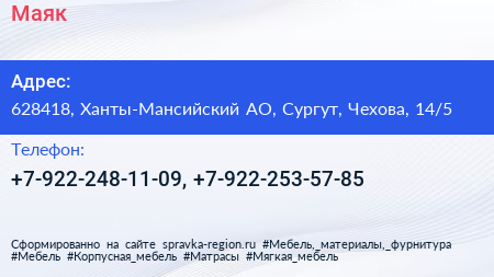 Маяк по адресу 628418, Ханты-Мансийский АО, Сургут, Чехова, 14/5 в дальнейшем Организация, размещена в следующих категориях: