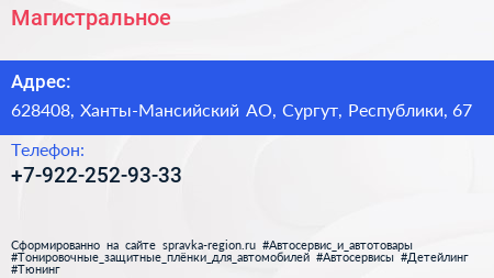 Магистральное по адресу 628408, Ханты-Мансийский АО, Сургут, Республики, 67 в дальнейшем Организация, размещена в следующих категориях: