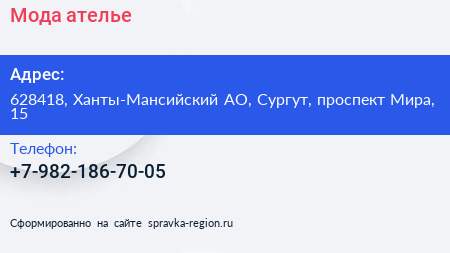 Мода, ателье по адресу 628418, Ханты-Мансийский АО, Сургут, проспект Мира, 15 в дальнейшем Организация, размещена в следующих категориях: