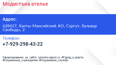 Модистъка, ателье по адресу 628417, Ханты-Мансийский АО, Сургут, бульвар Свободы, 2 в дальнейшем Организация, размещена в следующих категориях: