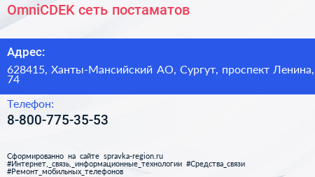 OmniCDEK, сеть постаматов по адресу 628415, Ханты-Мансийский АО, Сургут, проспект Ленина, 74 в дальнейшем Организация, размещена в следующих категориях: