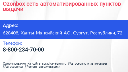 Ozonbox, сеть автоматизированных пунктов выдачи по адресу 628408, Ханты-Мансийский АО, Сургут, Республики, 72 в дальнейшем Организация, размещена в следующих категориях: