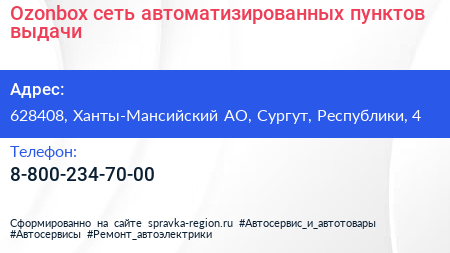Ozonbox, сеть автоматизированных пунктов выдачи по адресу 628408, Ханты-Мансийский АО, Сургут, Республики, 4 в дальнейшем Организация, размещена в следующих категориях: