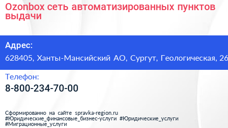 Ozonbox, сеть автоматизированных пунктов выдачи по адресу 628405, Ханты-Мансийский АО, Сургут, Геологическая, 26 в дальнейшем Организация, размещена в следующих категориях: