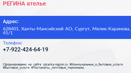 РЕГИНА, ателье по адресу 628401, Ханты-Мансийский АО, Сургут, Мелик-Карамова, 45/1 в дальнейшем Организация, размещена в следующих категориях: