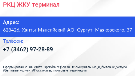 РКЦ ЖКУ, терминал по адресу 628426, Ханты-Мансийский АО, Сургут, Маяковского, 37 в дальнейшем Организация, размещена в следующих категориях: