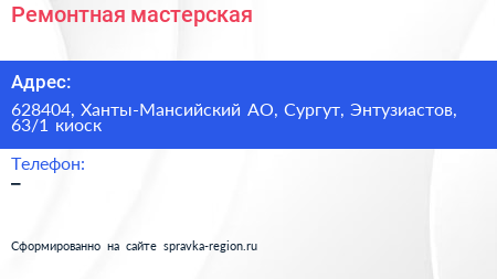 Ремонтная мастерская по адресу 628404, Ханты-Мансийский АО, Сургут, Энтузиастов, 63/1 киоск в дальнейшем Организация, размещена в следующих категориях: