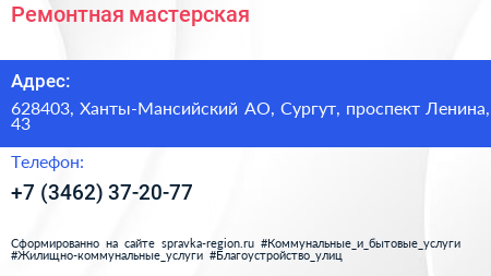Ремонтная мастерская по адресу 628403, Ханты-Мансийский АО, Сургут, проспект Ленина, 43 в дальнейшем Организация, размещена в следующих категориях: