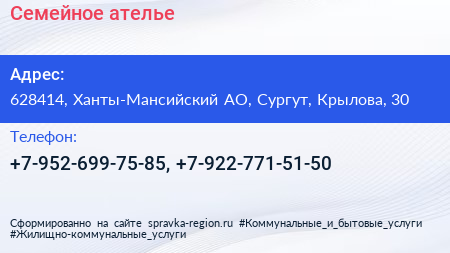 Семейное, ателье по адресу 628414, Ханты-Мансийский АО, Сургут, Крылова, 30 в дальнейшем Организация, размещена в следующих категориях: