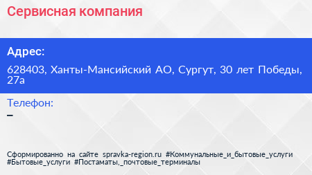 Сервисная компания по адресу 628403, Ханты-Мансийский АО, Сургут, 30 лет Победы, 27а в дальнейшем Организация, размещена в следующих категориях: