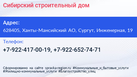 Сибирский строительный дом по адресу 628405, Ханты-Мансийский АО, Сургут, Инженерная, 19 в дальнейшем Организация, размещена в следующих категориях: