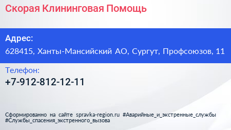 Скорая Клининговая Помощь по адресу 628415, Ханты-Мансийский АО, Сургут, Профсоюзов, 11 в дальнейшем Организация, размещена в следующих категориях: