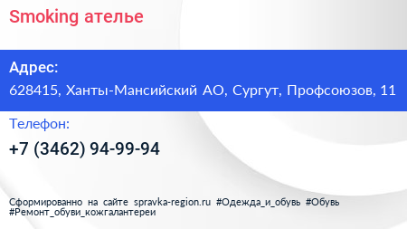 Smoking, ателье по адресу 628415, Ханты-Мансийский АО, Сургут, Профсоюзов, 11 в дальнейшем Организация, размещена в следующих категориях: