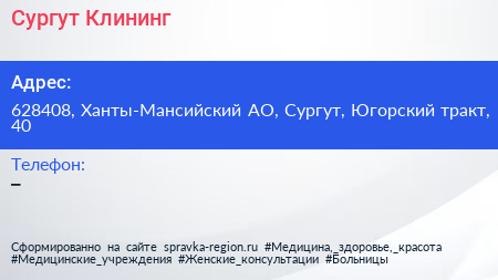 Сургут Клининг по адресу 628408, Ханты-Мансийский АО, Сургут, Югорский тракт, 40 в дальнейшем Организация, размещена в следующих категориях: