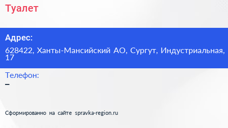 Туалет по адресу 628422, Ханты-Мансийский АО, Сургут, Индустриальная, 17 в дальнейшем Организация, размещена в следующих категориях: