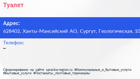Туалет по адресу 628402, Ханты-Мансийский АО, Сургут, Геологическая, 10 в дальнейшем Организация, размещена в следующих категориях: