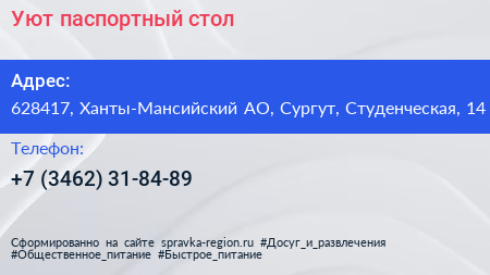 Уют, паспортный стол по адресу 628417, Ханты-Мансийский АО, Сургут, Студенческая, 14 в дальнейшем Организация, размещена в следующих категориях: