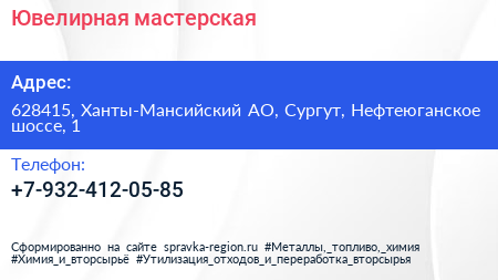 Ювелирная мастерская по адресу 628415, Ханты-Мансийский АО, Сургут, Нефтеюганское шоссе, 1 в дальнейшем Организация, размещена в следующих категориях: