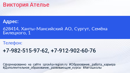 Виктория, Ателье по адресу 628414, Ханты-Мансийский АО, Сургут, Семёна Билецкого, 1 в дальнейшем Организация, размещена в следующих категориях: