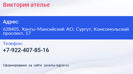 Виктория, ателье по адресу 628405, Ханты-Мансийский АО, Сургут, Комсомольский проспект, 17 в дальнейшем Организация, размещена в следующих категориях: