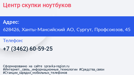 Центр скупки ноутбуков по адресу 628426, Ханты-Мансийский АО, Сургут, Профсоюзов, 45 в дальнейшем Организация, размещена в следующих категориях: