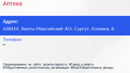 Аптека по адресу 628414, Ханты-Мансийский АО, Сургут, Есенина, 8 в дальнейшем Организация, размещена в следующих категориях:
