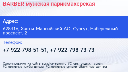BARBER, мужская парикмахерская по адресу 628416, Ханты-Мансийский АО, Сургут, Набережный проспект, 2 в дальнейшем Организация, размещена в следующих категориях: