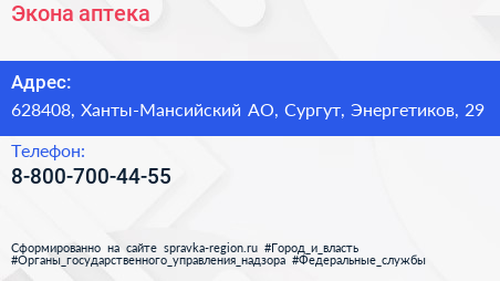 Экона, аптека по адресу 628408, Ханты-Мансийский АО, Сургут, Энергетиков, 29 в дальнейшем Организация, размещена в следующих категориях: