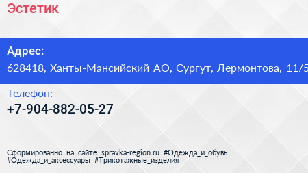Эстетик по адресу 628418, Ханты-Мансийский АО, Сургут, Лермонтова, 11/5 в дальнейшем Организация, размещена в следующих категориях:
