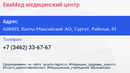 ЕваМед, медицинский центр по адресу 628403, Ханты-Мансийский АО, Сургут, Рабочая, 41 в дальнейшем Организация, размещена в следующих категориях: