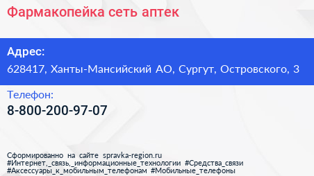 Фармакопейка, сеть аптек по адресу 628417, Ханты-Мансийский АО, Сургут, Островского, 3 в дальнейшем Организация, размещена в следующих категориях: