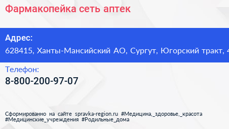 Фармакопейка, сеть аптек по адресу 628415, Ханты-Мансийский АО, Сургут, Югорский тракт, 4 в дальнейшем Организация, размещена в следующих категориях: