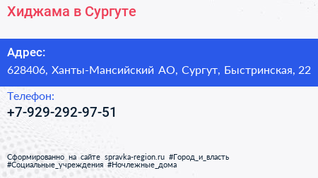 Хиджама в Сургуте по адресу 628406, Ханты-Мансийский АО, Сургут, Быстринская, 22 в дальнейшем Организация, размещена в следующих категориях:
