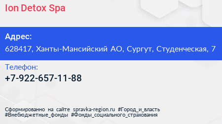 Ion Detox Spa по адресу 628417, Ханты-Мансийский АО, Сургут, Студенческая, 7 в дальнейшем Организация, размещена в следующих категориях: