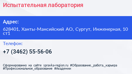 Испытательная лаборатория по адресу 628401, Ханты-Мансийский АО, Сургут, Инженерная, 10 ст1 в дальнейшем Организация, размещена в следующих категориях: