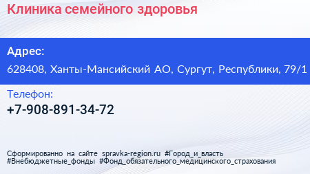 Клиника семейного здоровья по адресу 628408, Ханты-Мансийский АО, Сургут, Республики, 79/1 в дальнейшем Организация, размещена в следующих категориях: