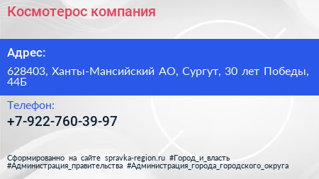 Космотерос, компания по адресу 628403, Ханты-Мансийский АО, Сургут, 30 лет Победы, 44Б в дальнейшем Организация, размещена в следующих категориях: