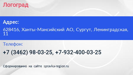 Логоград по адресу 628416, Ханты-Мансийский АО, Сургут, Ленинградская, 11 в дальнейшем Организация, размещена в следующих категориях: