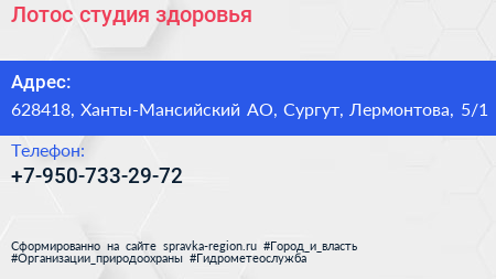 Лотос, студия здоровья по адресу 628418, Ханты-Мансийский АО, Сургут, Лермонтова, 5/1 в дальнейшем Организация, размещена в следующих категориях: