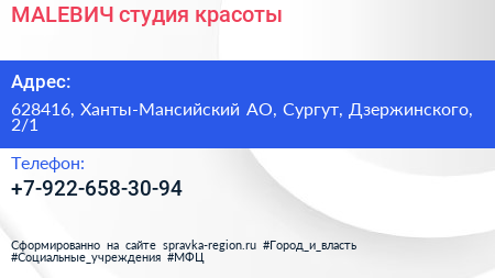 МАLЕВИЧ, студия красоты по адресу 628416, Ханты-Мансийский АО, Сургут, Дзержинского, 2/1 в дальнейшем Организация, размещена в следующих категориях: