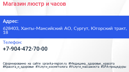 Магазин люстр и часов по адресу 628403, Ханты-Мансийский АО, Сургут, Югорский тракт, 18 в дальнейшем Организация, размещена в следующих категориях: