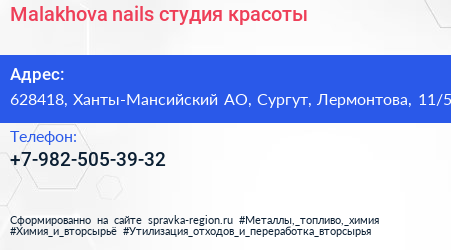 Malakhova nails, студия красоты по адресу 628418, Ханты-Мансийский АО, Сургут, Лермонтова, 11/5 в дальнейшем Организация, размещена в следующих категориях: