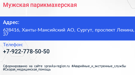 Мужская парикмахерская по адресу 628416, Ханты-Мансийский АО, Сургут, проспект Ленина, 37 в дальнейшем Организация, размещена в следующих категориях:
