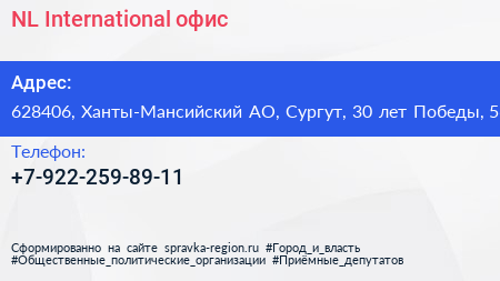 NL International, офис по адресу 628406, Ханты-Мансийский АО, Сургут, 30 лет Победы, 56 в дальнейшем Организация, размещена в следующих категориях: