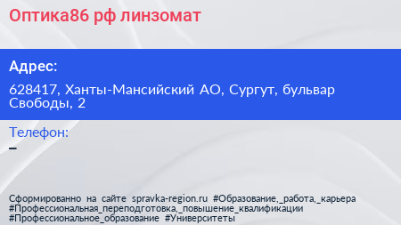 Оптика86.рф, линзомат по адресу 628417, Ханты-Мансийский АО, Сургут, бульвар Свободы, 2 в дальнейшем Организация, размещена в следующих категориях: